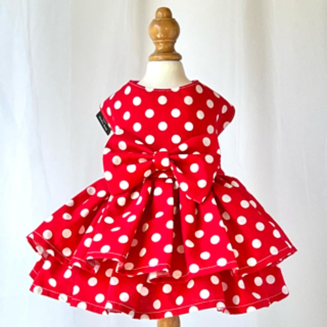 華やかな水玉模様の真っ赤なギャザードレス。 たっぷりのギャザーのふわふわスカートは可愛らしさ満点。特別な日のお出かけやパーティーシーンにもぴったりです。 首周りと胴回りはマジックテープで簡単に調整が可能ですので、お着替えが苦手なワンちゃんでも簡単に着せることができます。 マジックテープは毛が絡まりにくい素材を使用しています。 リボンは取り外し可能です。 サイズ:M 本体生地:コットン100% 付属リボン:コットン100% (伸縮性なし) ▪️商品画像最終ページのサイズ表でサイズのご確認をお願いいたします。