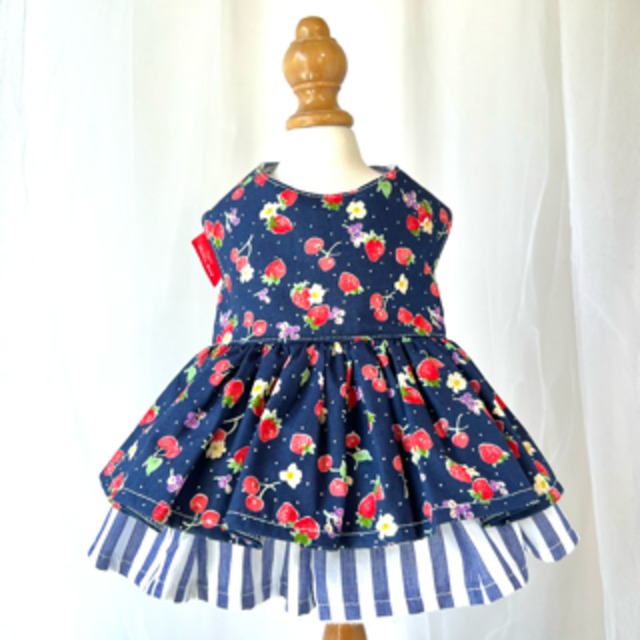 真っ赤なベリーたっぷりの生地を上段に選びました。 下段のストライプネイビーの柄を合わせて可愛らしい一枚になりました。 見頃見返しには表地と同じフルーツベリー(またはストライプネイビー)の生地を使用しています。 首周りと胴回りをマジックテープで固定するだけですのでお着替えが苦手なワンちゃんでも簡単に着せることができます。 サイズ:XS ▪️の商品画像最終ページのサイズ表でサイズのご確認をお願いいたします。 本体生地:コットン100% (伸縮性なし)