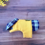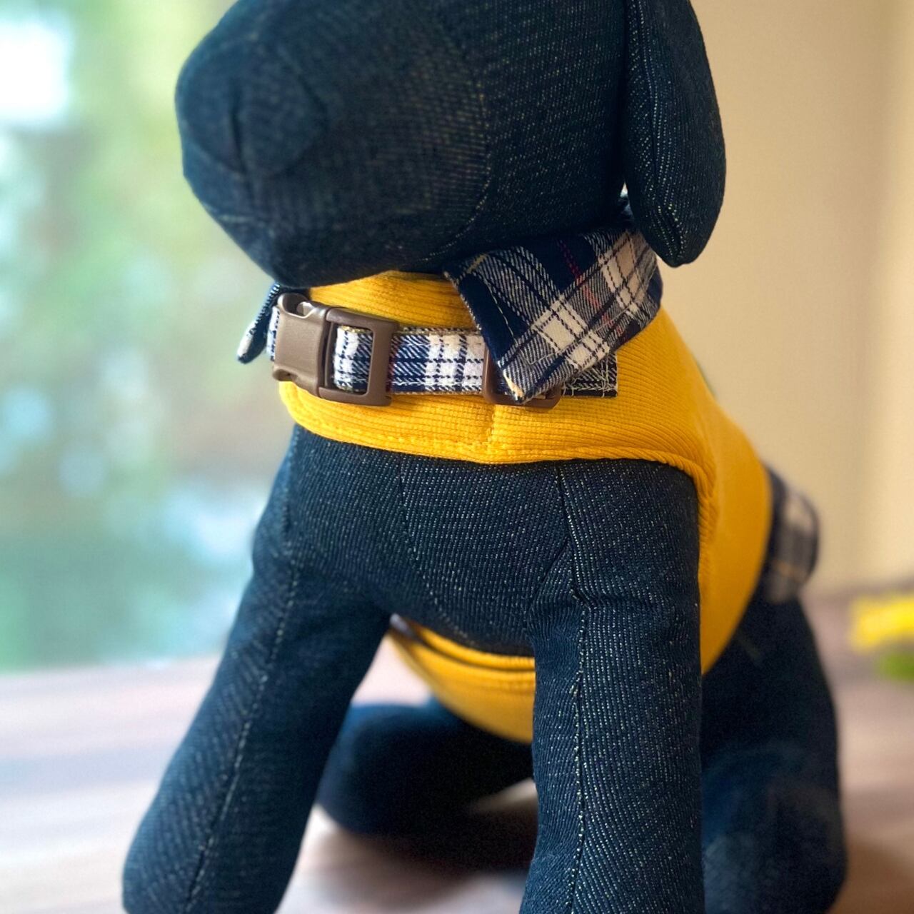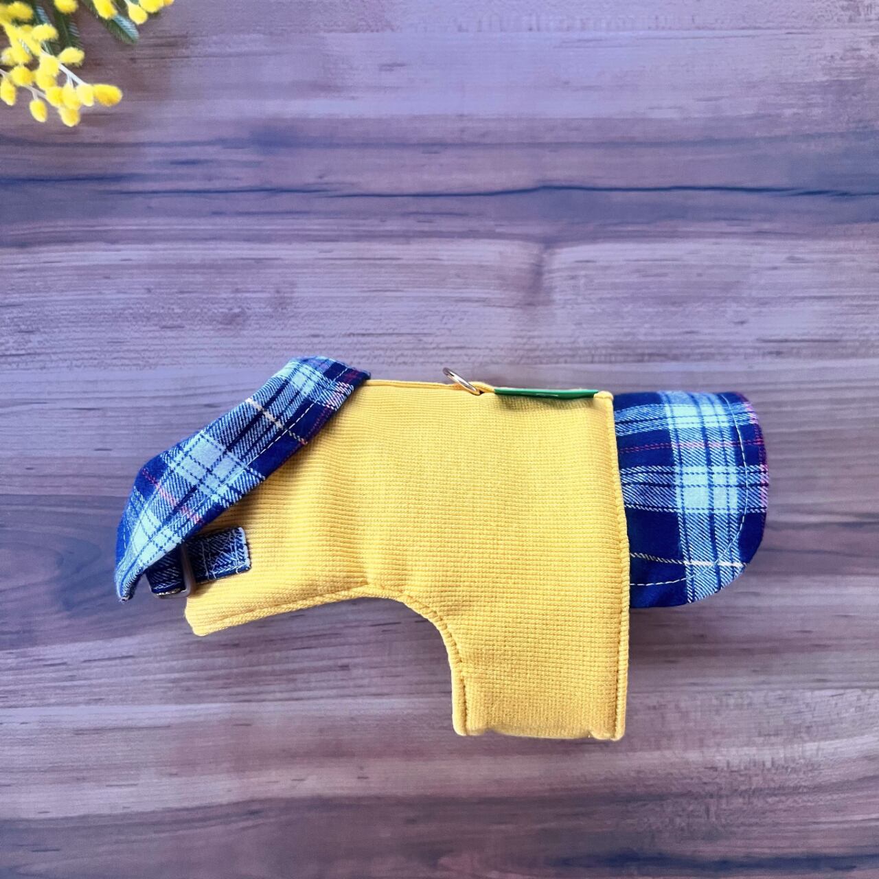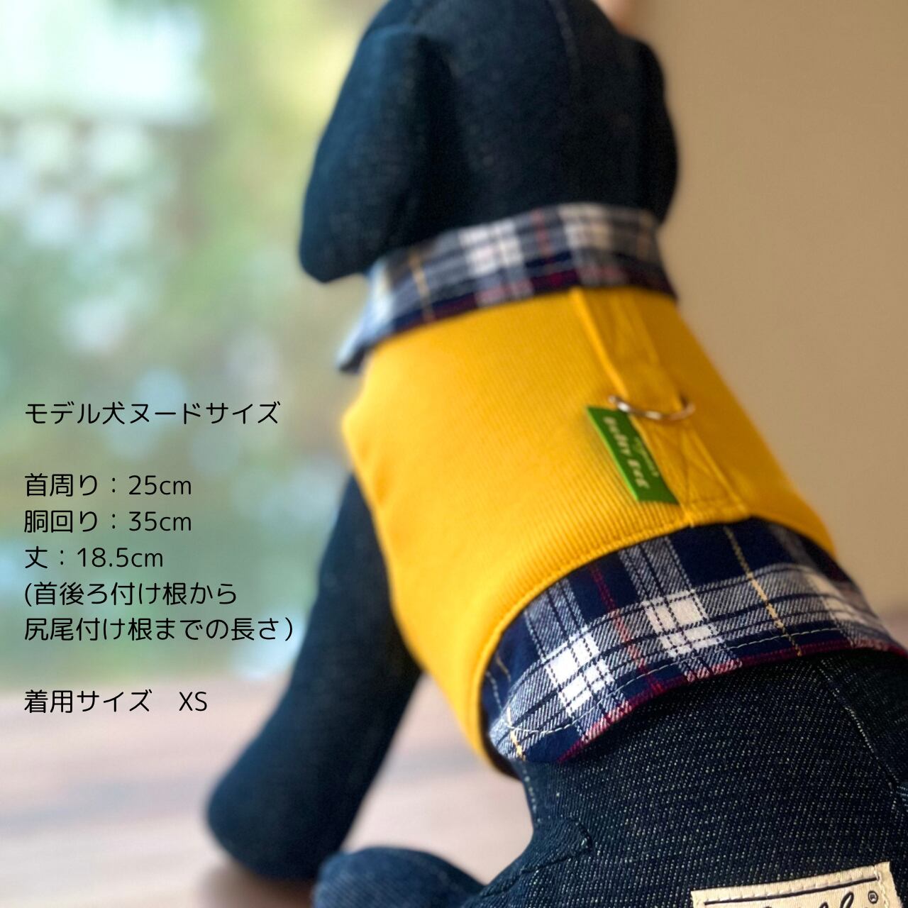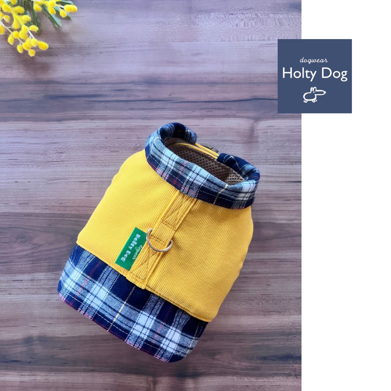 温かみのあるイエローのニット素材と柔らかいフランネルチェックを組み合わせた一着。お散歩のひと時を楽しく彩ります。