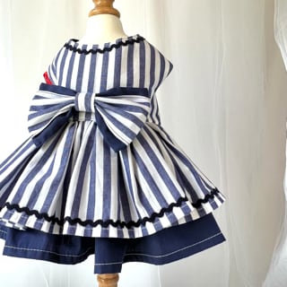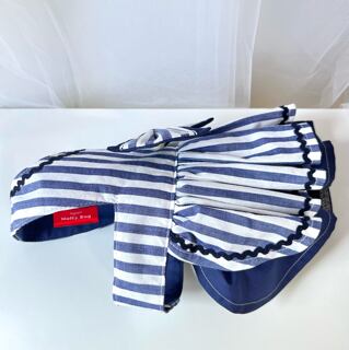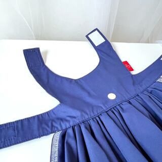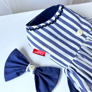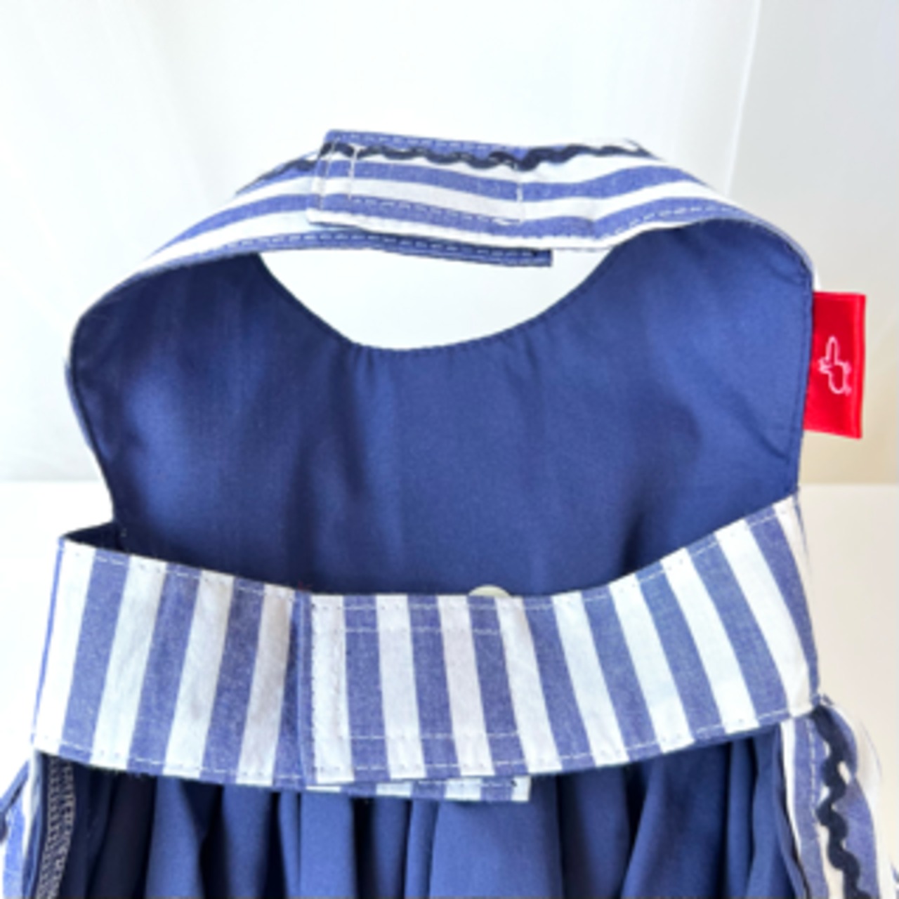 襟元とスカート裾にはブレードテープを施しました。上段のストライプブルーと下段のネイビーのコンビで爽やかな色合いです。