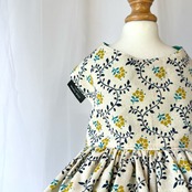 蔓と小花が広がる生地のギャザードレスです。