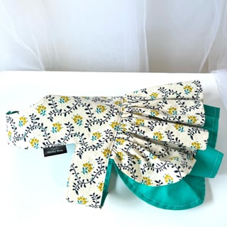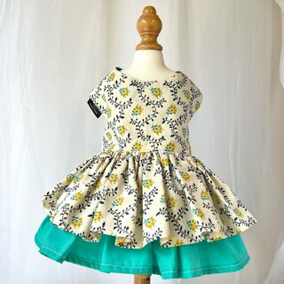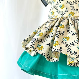 落ち着いた生成り色の生地の下には明るいグリーンの生地を合わせてシンプルながらも可愛らしいドレスになりました。